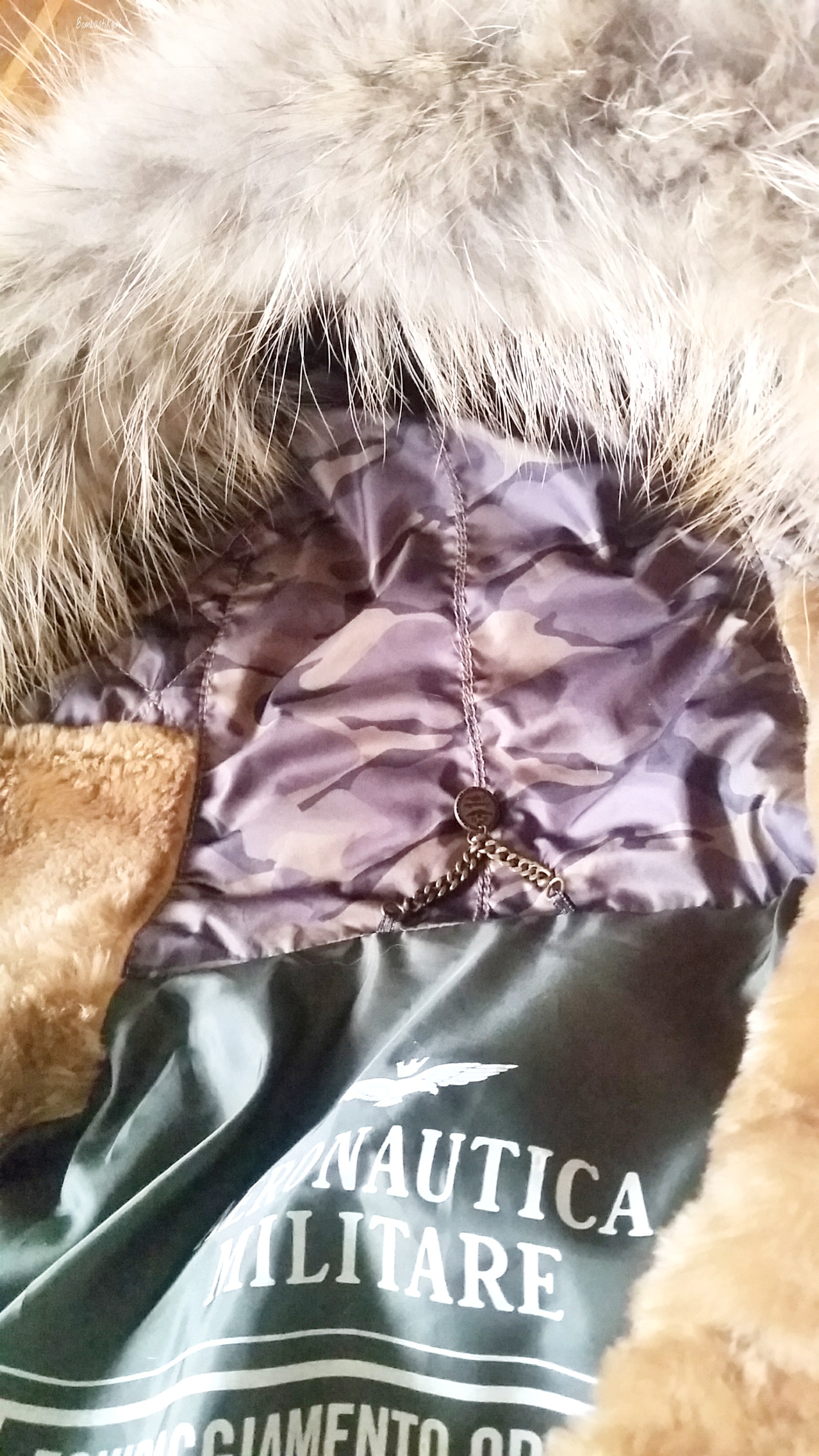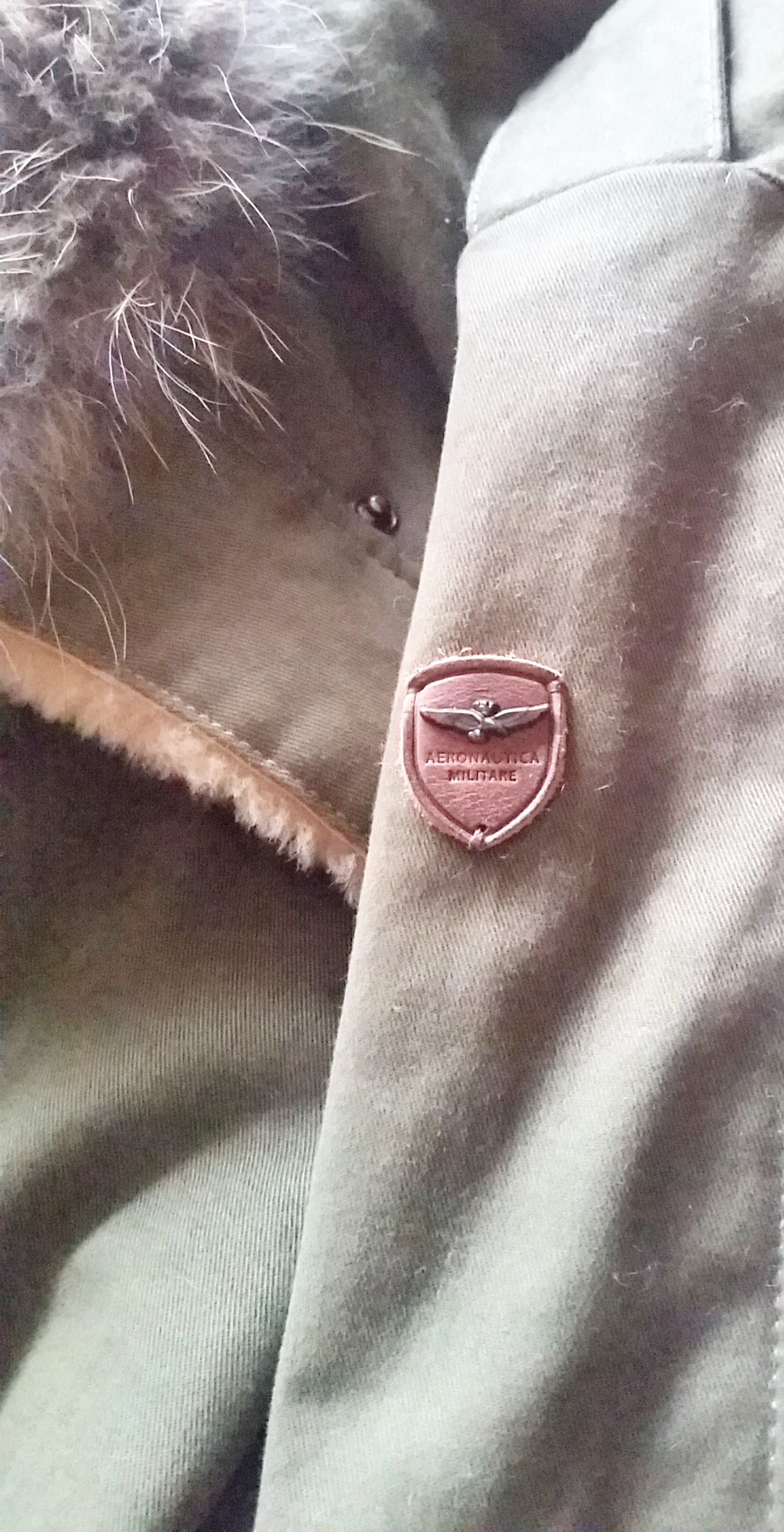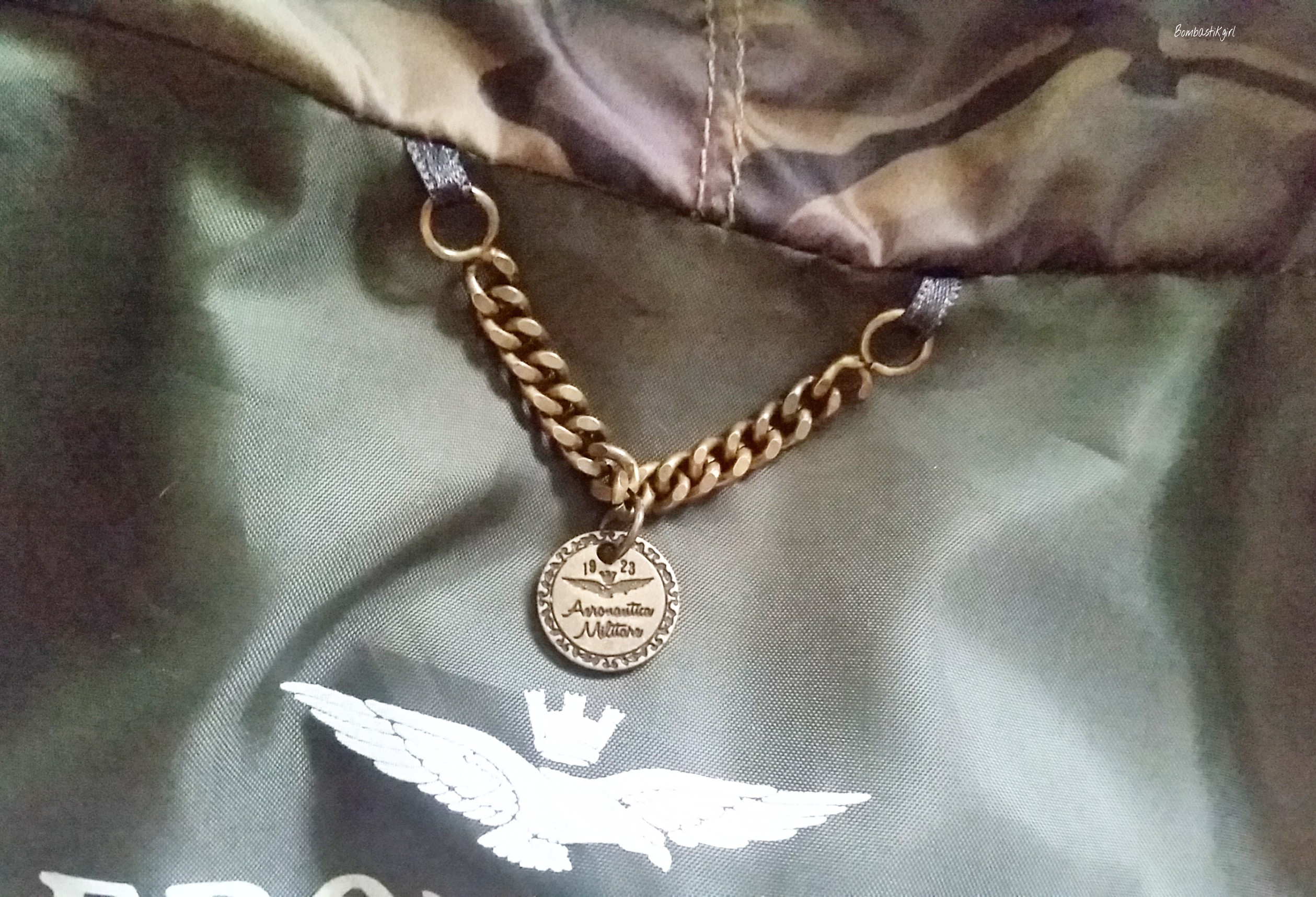 Sur la manche gauche, on trouve un très joli écusson, discret, avec un aigle et toujours l’inscription de la marque. Sur les manches, deux boutons avec l’inscription de la marque en métal vieillit, une chaînette à l’intérieur du manteau toujours en métal vieillit, une étiquette et un imprimé à l’intérieur du manteau, l’intérieur de la capuche en imprimé camouflage… moi qui aime tous ces petits rappels, avec Aeronautica Militare, je suis comblée !