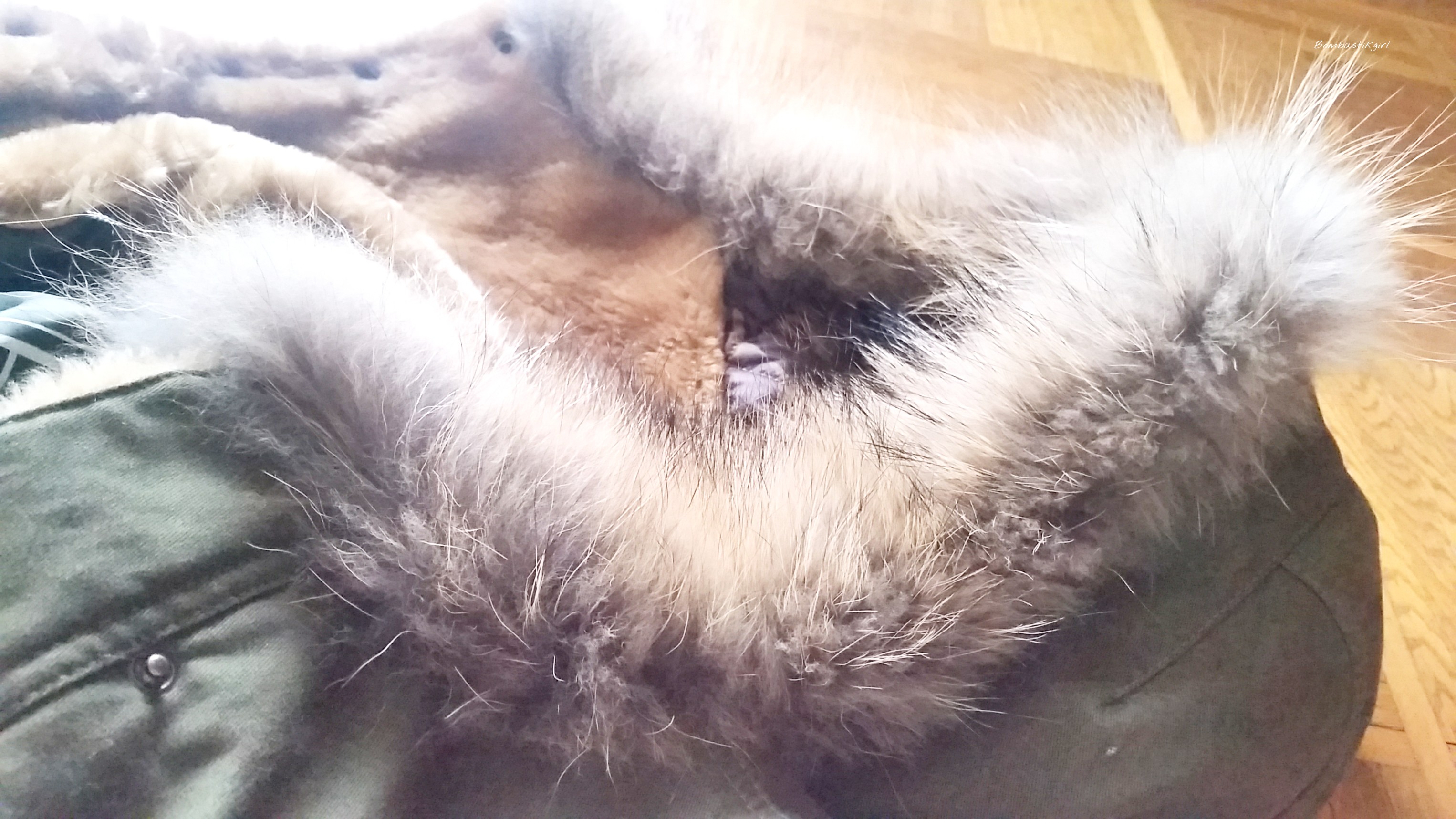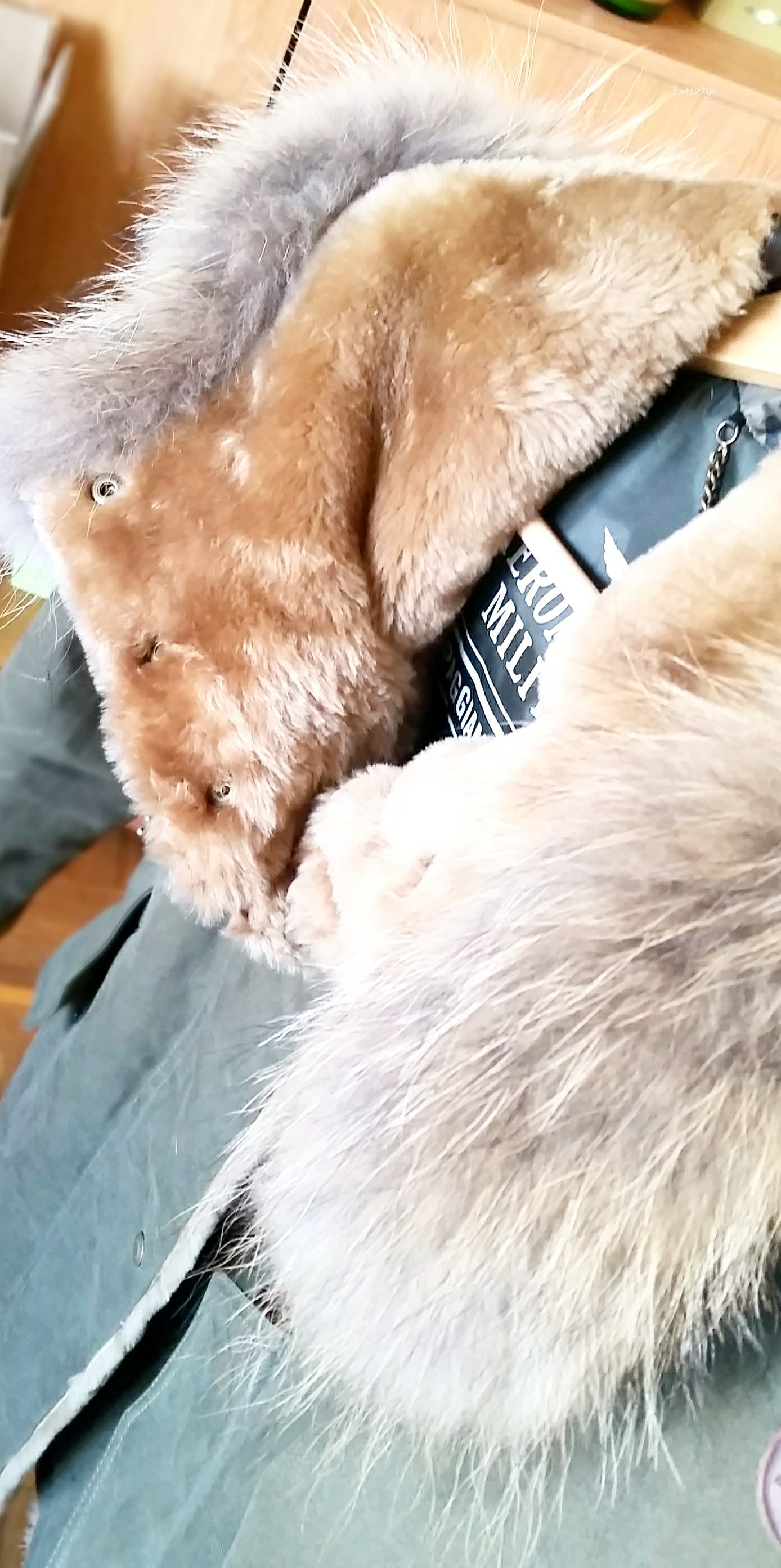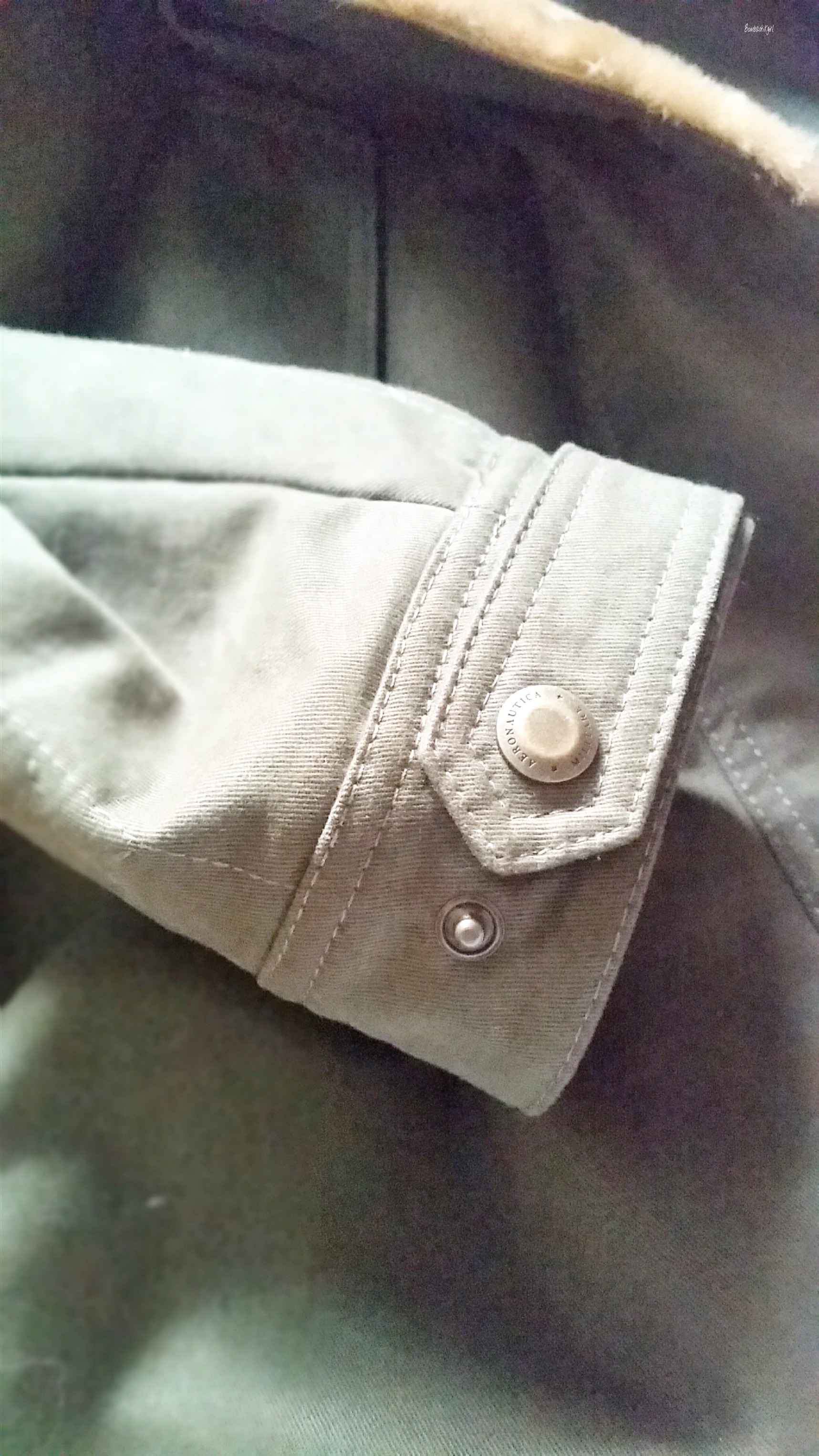 Sur la manche gauche, on trouve un très joli écusson, discret, avec un aigle et toujours l’inscription de la marque. Sur les manches, deux boutons avec l’inscription de la marque en métal vieillit, une chaînette à l’intérieur du manteau toujours en métal vieillit, une étiquette et un imprimé à l’intérieur du manteau, l’intérieur de la capuche en imprimé camouflage… moi qui aime tous ces petits rappels, avec Aeronautica Militare, je suis comblée !