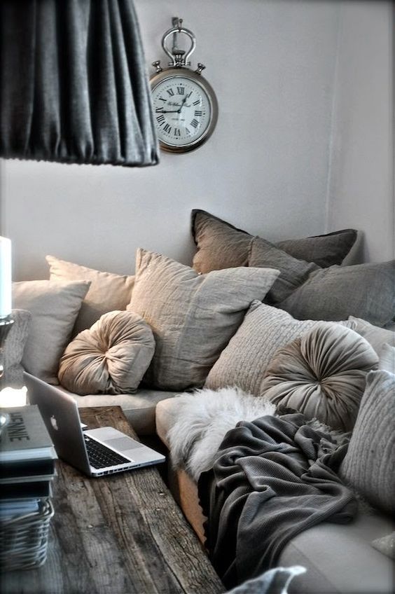 Des tonnes de coussins, des teintes de gris, une pendule qui en jette, je me sens bien là, pas vous ?(inspirationsdeco.blogspot.fr)