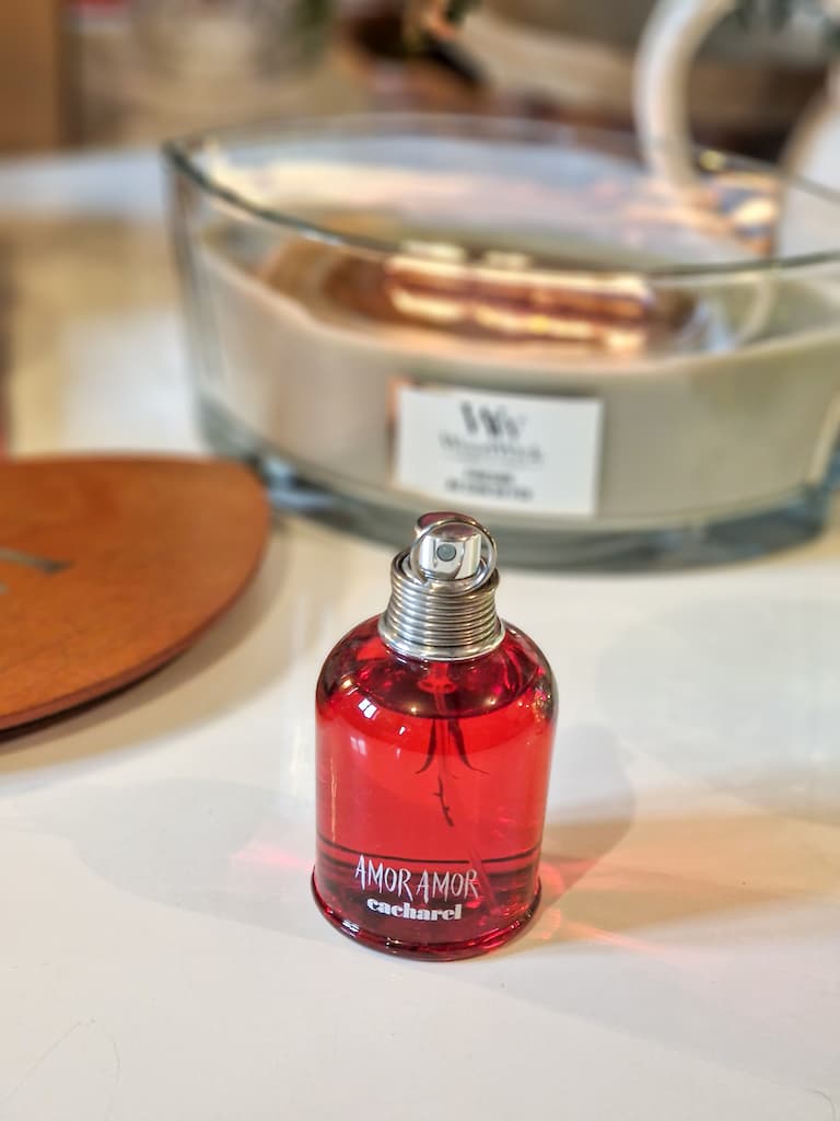 Impossible de ne pas citer Amor Amor de Cacharel. Lui aussi a beaucoup accompagné mes années lycée. C’est une petite grenade rouge qu’on dégoupille ! C’est le parfum du coup de foudre, hyper gourmand avec ses fruits rouges, son cassis et son orange sanguine. Il a ce côté « philtre d’amour » caramélisé qui rend accro.