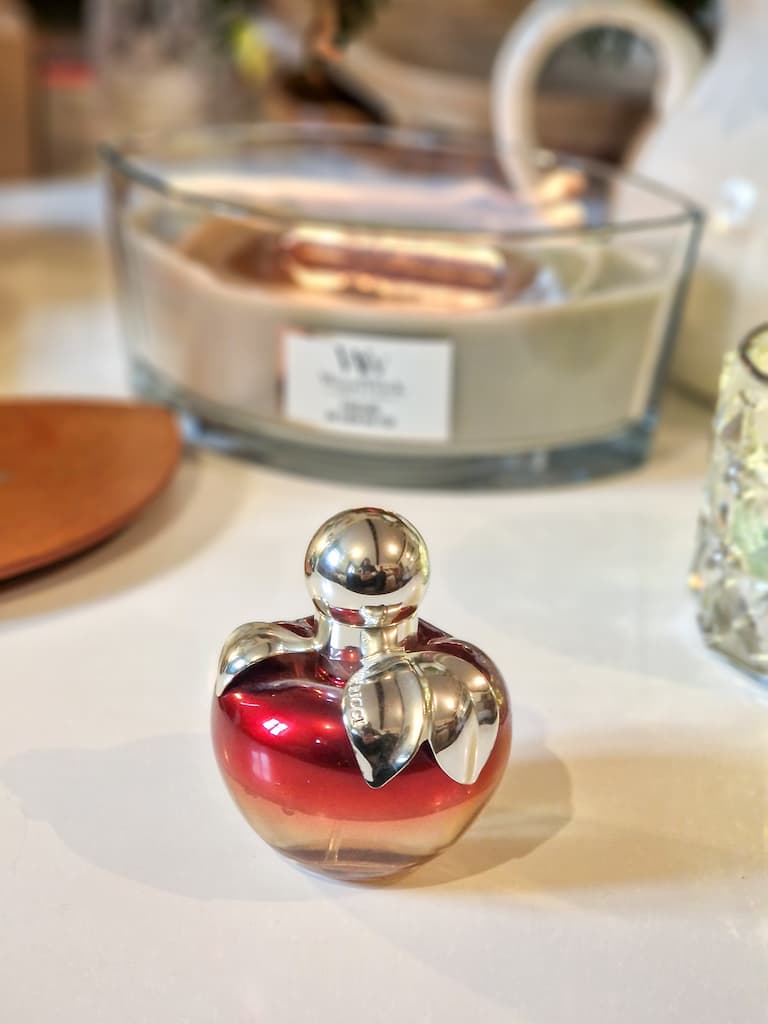 Et pour finir sur une note tout aussi gourmande, l’incontournable Nina de Nina Ricci. La fameuse pomme. J’ai aimé son côté acidulé (citron vert, citron Caipirinha) qui fond dans le praliné et la pomme d’amour. C’est une friandise olfactive qui a vu naître plein de versions, mais l’original reste une madeleine de Proust sucrée.