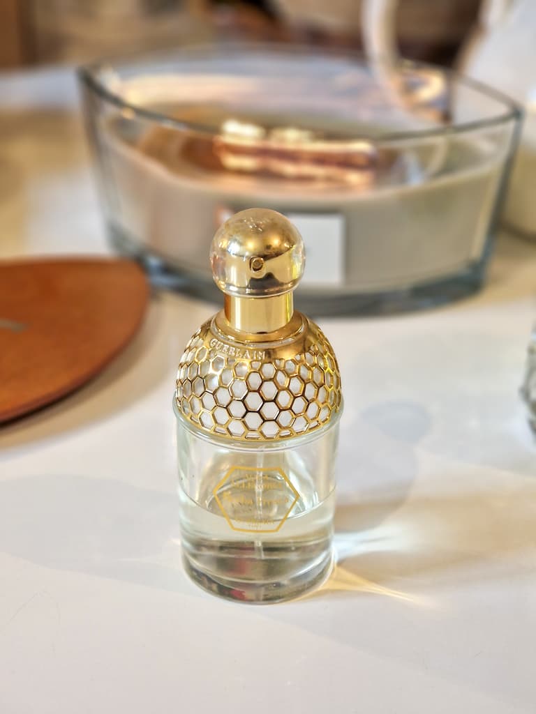 Et puis, il y a Herba Fresca (Aqua Allegoria) de Guerlain. Celui-ci, c’est un coup au cœur immédiat. C’est l’été qui explose. Je ferme les yeux et je nous revois : toutes les deux, séances de bronzette dans le jardin à Honfleur, nos promenades vers le vieux bassin, le lèche-vitrine dans les petites boutiques pavées… C’est une odeur d’herbe coupée perlée de rosée, de menthe fraîche, de thé vert. C’est tonique, c’est le soleil, c’est la vie. Et c’est tellement elle.