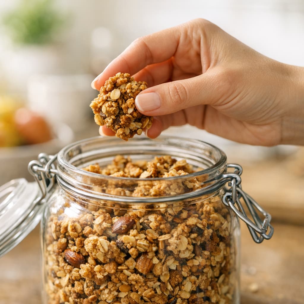 - La patience : c’est l’étape cruciale. À la sortie du four, le granola est encore mou. C’est normal ! Il durcit en refroidissant. Laissez-le refroidir complètement sur la plaque sans y toucher. C’est là que les pépites se figent.