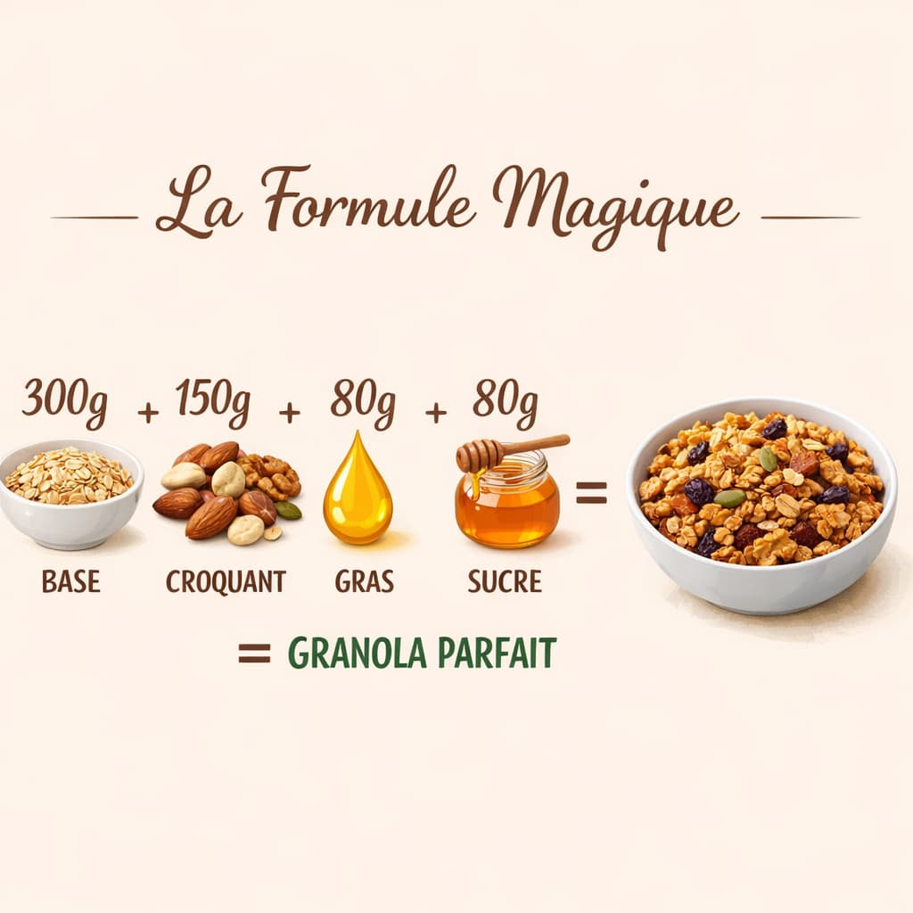Pas besoin d’être pâtissière. Le granola, c’est de la chimie simple. Pour réussir, il suffit de respecter ce ratio :