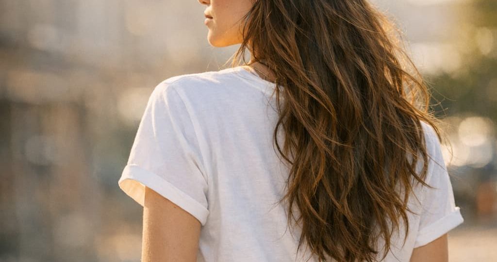 Un peu de spray texturant, je ramène tout en arrière avec les doigts (surtout PAS de raie au milieu, c’est la clé pour éviter l’effet plat !), et je pose. Les ondulations ressortent naturellement sur les côtés.