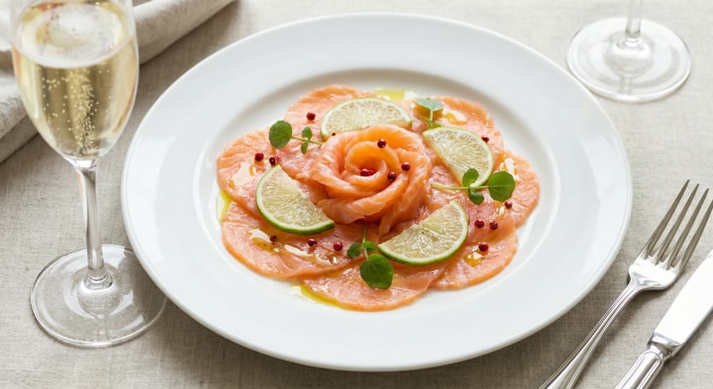 - En plat : un carpaccio de saumon mariné à l’huile d’olive, citron vert et baies roses.