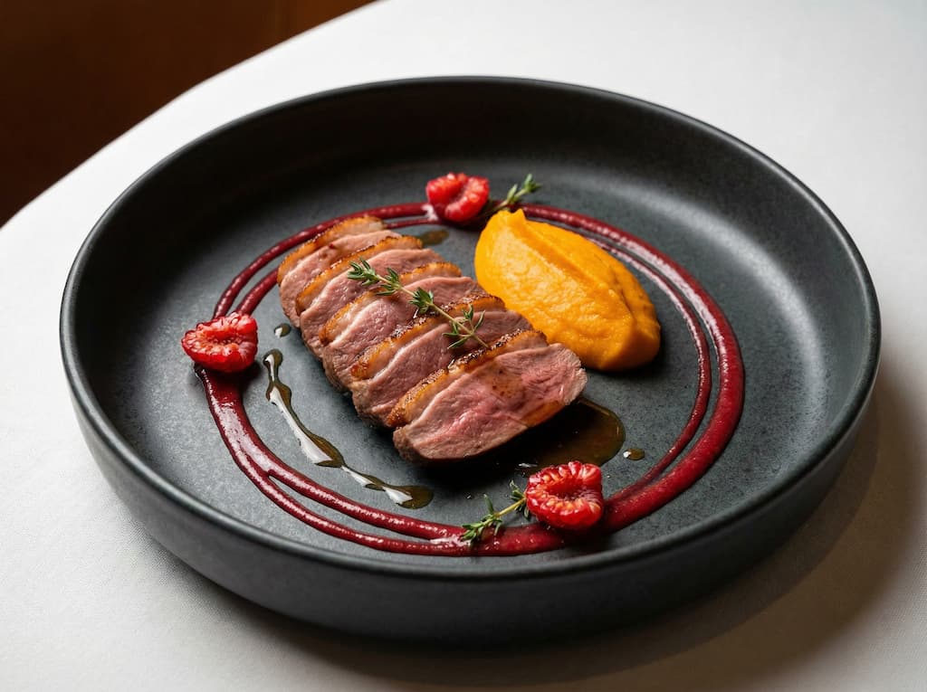 - En plat : un magret de canard rosé, coupé en tranches fines, servi avec une sauce aux framboises et une purée de patates douces.