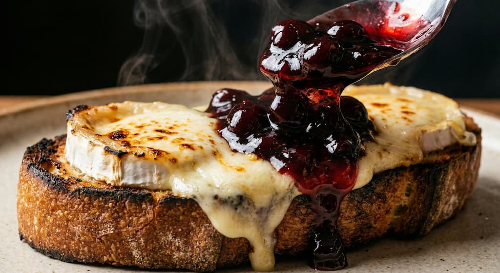 - En entrée : des toasts de pain de campagne avec un chèvre frais et une petite cuillère de confiture de cerises noires.