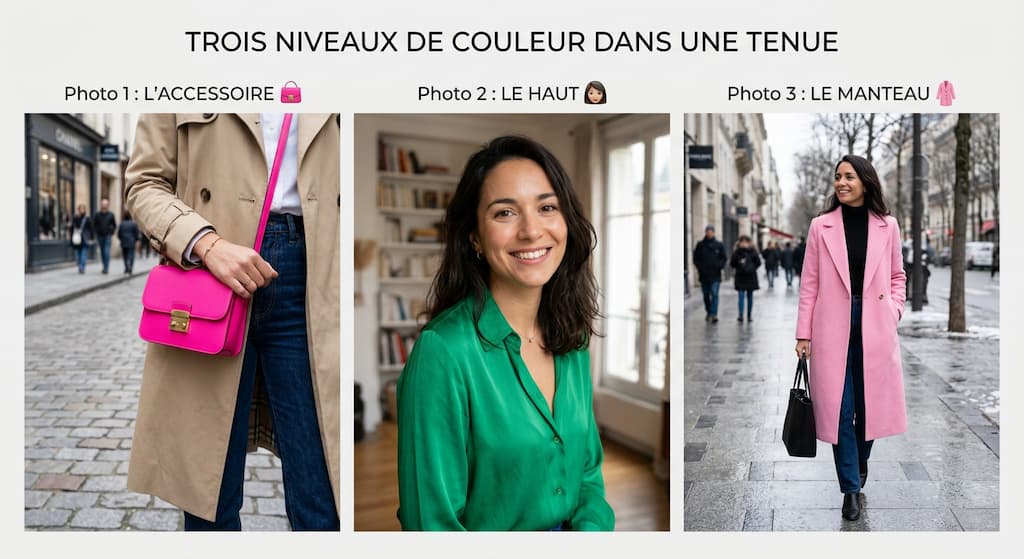 Conservez votre base rassurante (un beau jean, un pull noir ou gris), mais venez « twister » l’ensemble avec un accessoire d’une teinte explosive. Un sac à main rouge pompier, une paire de baskets vert pomme, ou une grosse écharpe jaune moutarde. C’est le détail qui attire l’œil et les compliments (et les compliments, ça booste l’ego !).